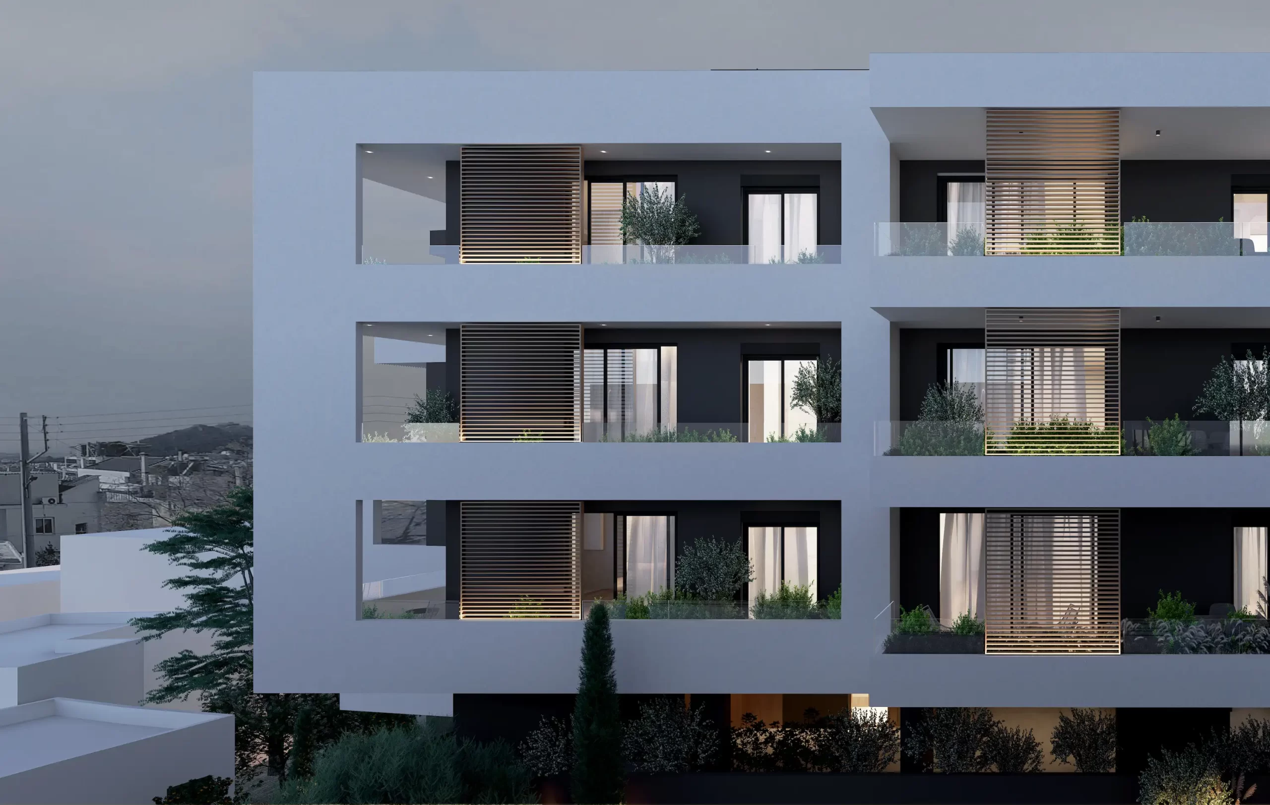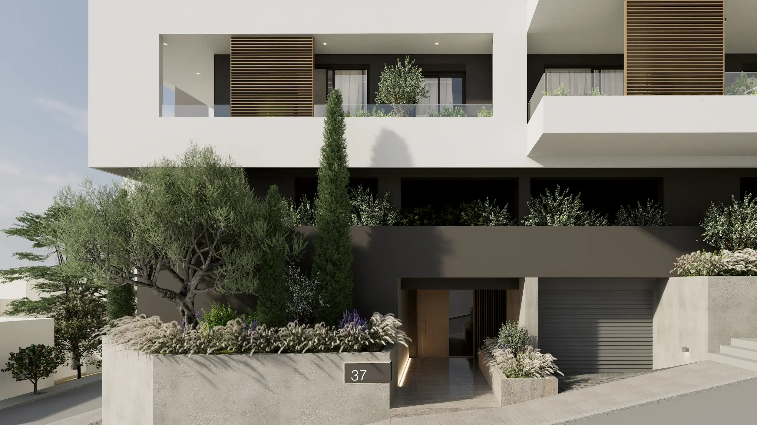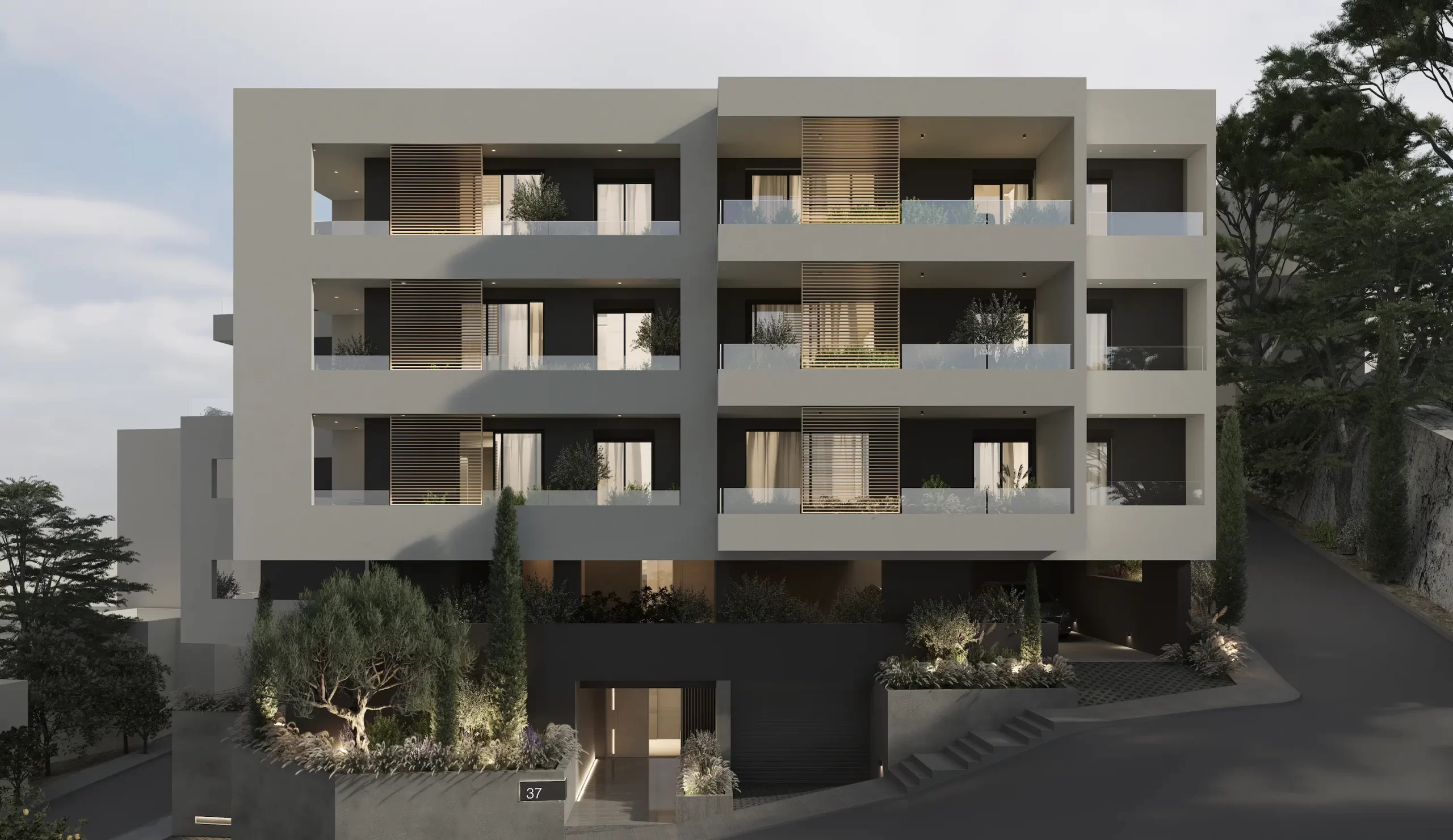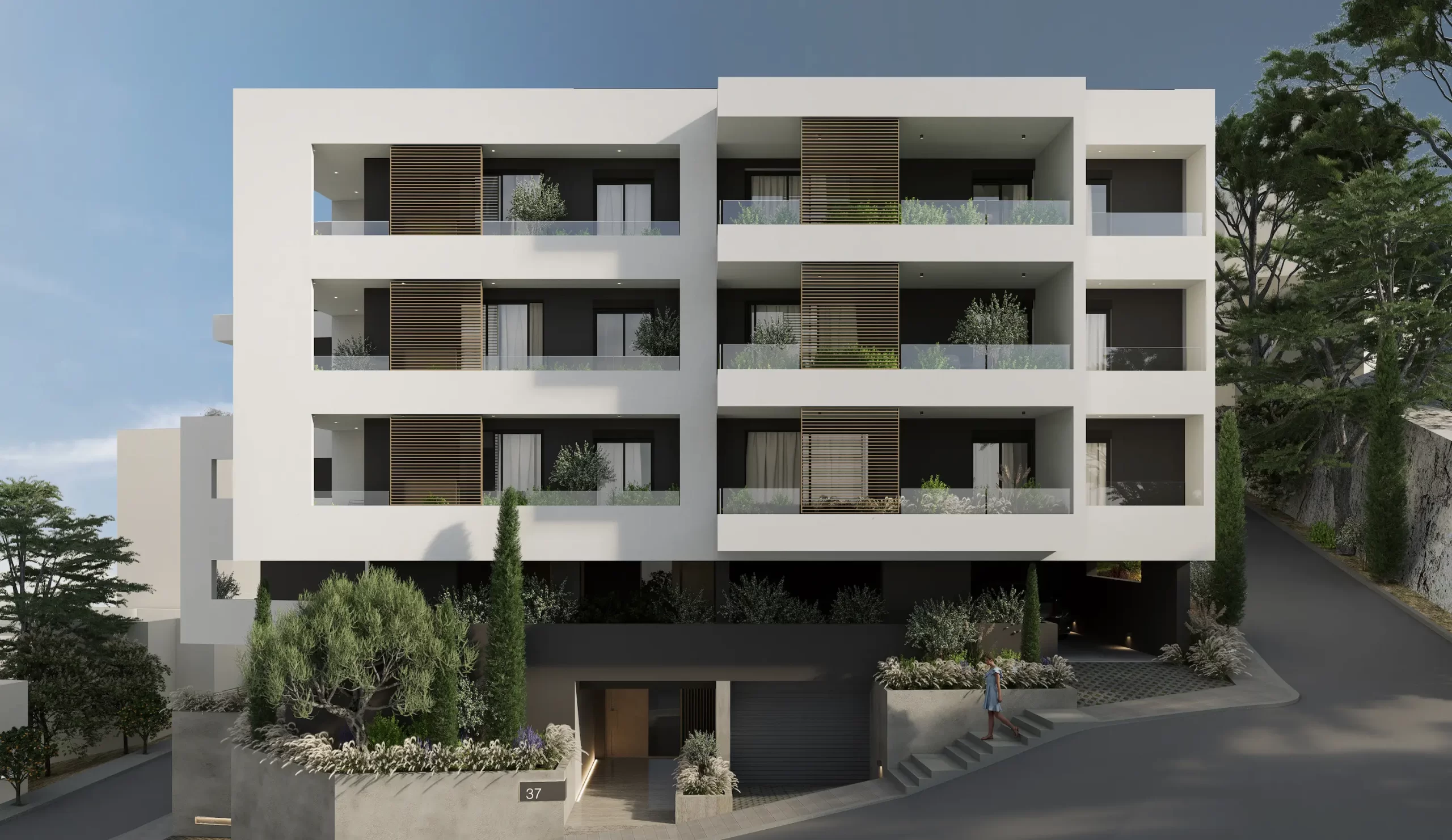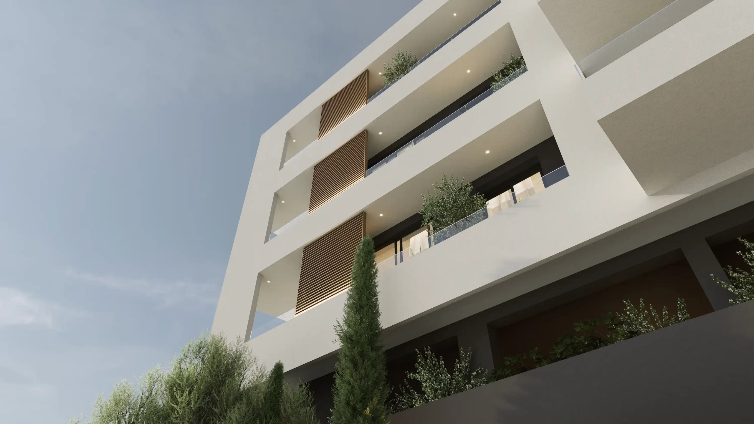 The building’s clean linear form and layered façade provide depth and rhythm, while natural textures and strategic planting soften its architectural presence. Generous balconies and large openings invite natural light into every apartment, establishing a seamless connection between interior spaces and the surrounding environment.